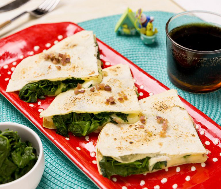Precalienta el horno a 180º, y mientras tanto, saltea los trocitos de jamón en una sartén. Estira las tortillas en una bandeja y añade las espinacas en el centro de cada una con un poco de queso rallado por encima y los taquitos de jamón. Finalmente, dobla por la mitad e introduce en el horno hasta conseguir que se funda por completo el queso, ¡y sírvelo decorando con un poco de tomate!