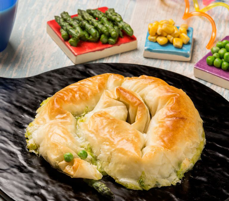 Mientras se precalienta el horno a 180º, estira las cuatro hojas de pasta filo sobre un papel de horno. En el centro de cada hoja coloca el relleno de verduras de forma que se pueda enrollar. Luego, para que quede en forma de serpiente, coloca los rollitos uno detrás del otro en forma de espiral. Agrega sobre la pasta mantequilla derretida al gusto y hornea durante 15-20 minutos, ¡y tendrás tu plato listo!